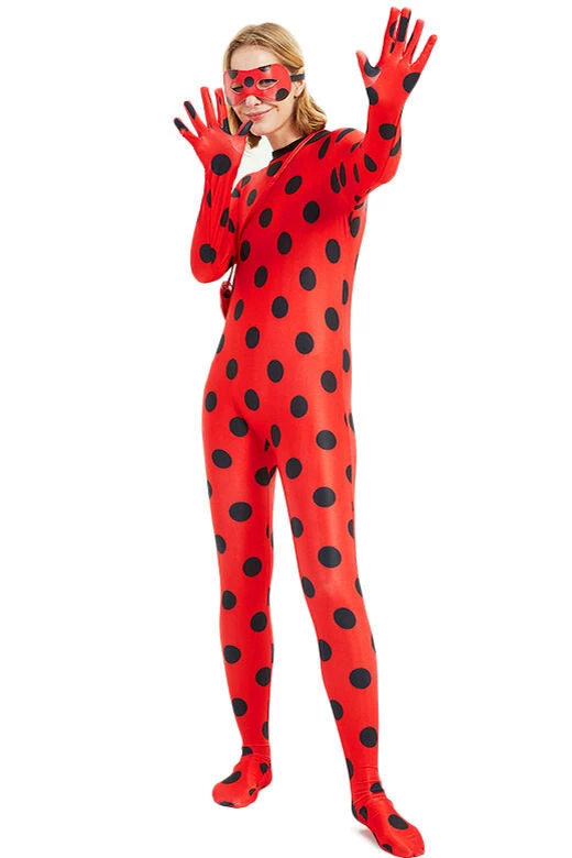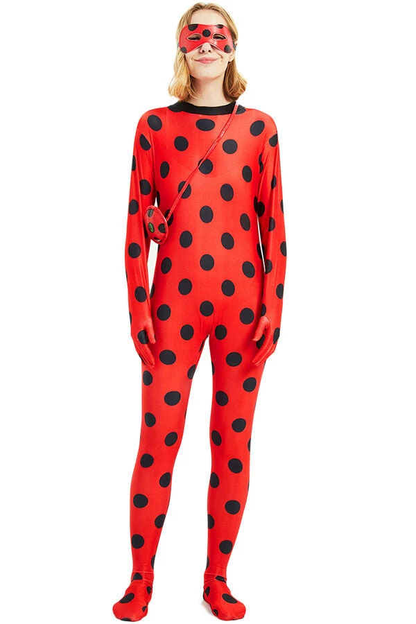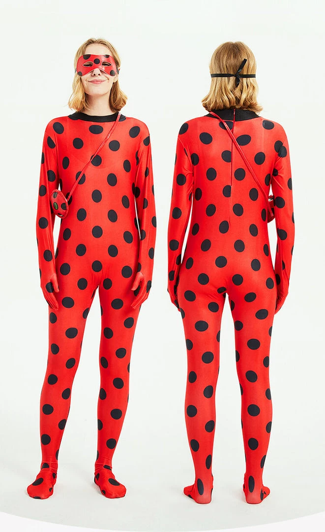 Miraculous ladybug halloween costume for adult. The costume set comes with a footed bodysuit, an eye mask and a little bag. Miraculous Ladybug costume is made of very soft milk fibre which is comfortable and stretchy.