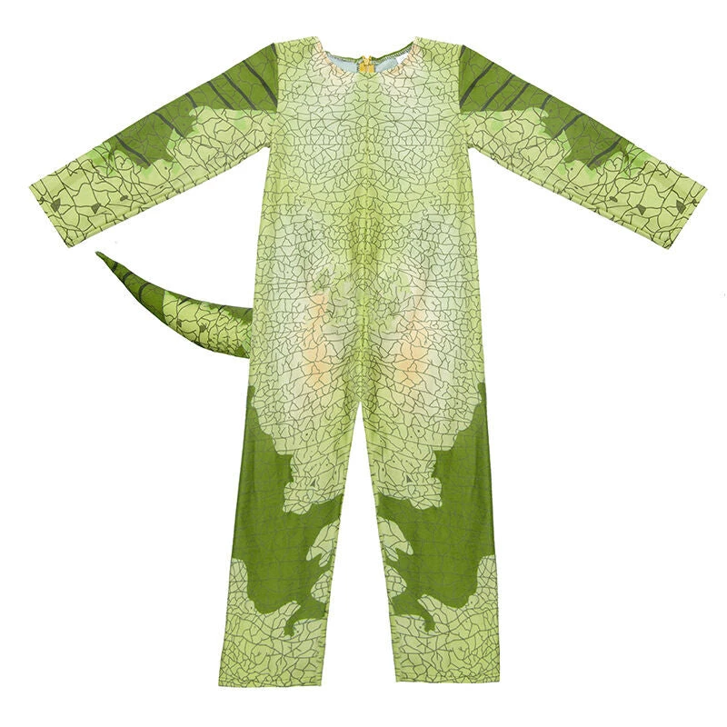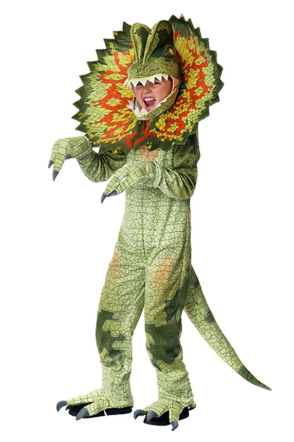 Kids Dilophosaurus costume comes with dinosaur head helmet, bodysuit, gloves and shoe covers. The head is very realistic.