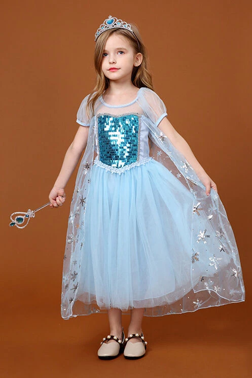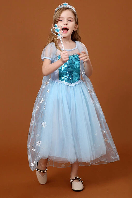 Frozen elsa inspired blue dress for kids girls. The dress has cotton lining and beautiful sequins. It is perfect for girls parties or birthdays. Accessories include crown, wand, and gloves.