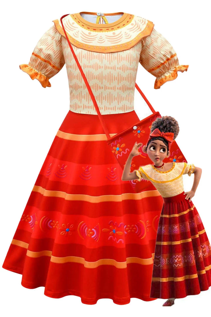 Encanto Dolores Madrigal dress for girls. The costume comes with a shoulder bag.