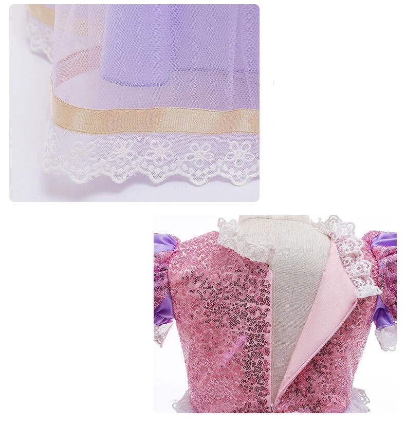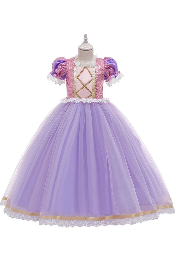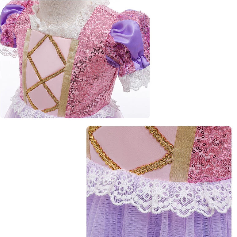Princess Rapunzel dress for kids. It fetures sequins, lovely lace trimming and puffy tulle skirt.