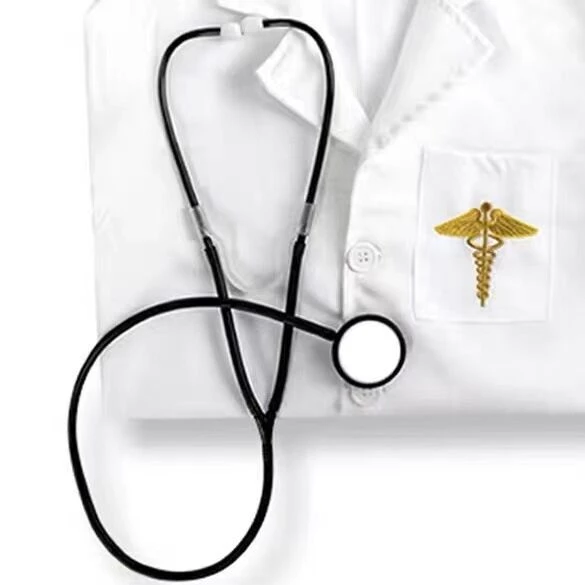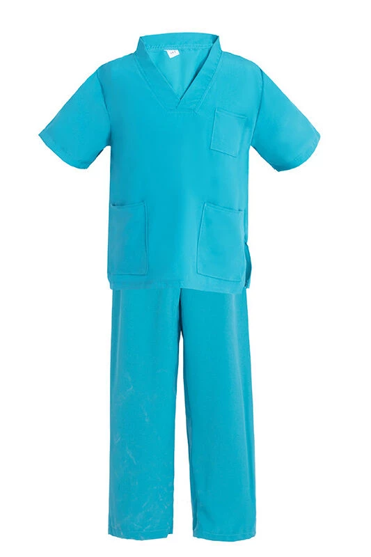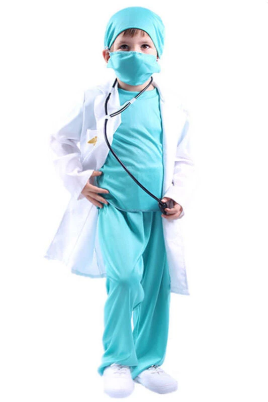 Children role play doctor oufit. The costume comes with the blue surgery outfit, white coat, cap, face mask and stethoscope. The coat is not too soft so it looks smart. The logo on the coat is stitched.