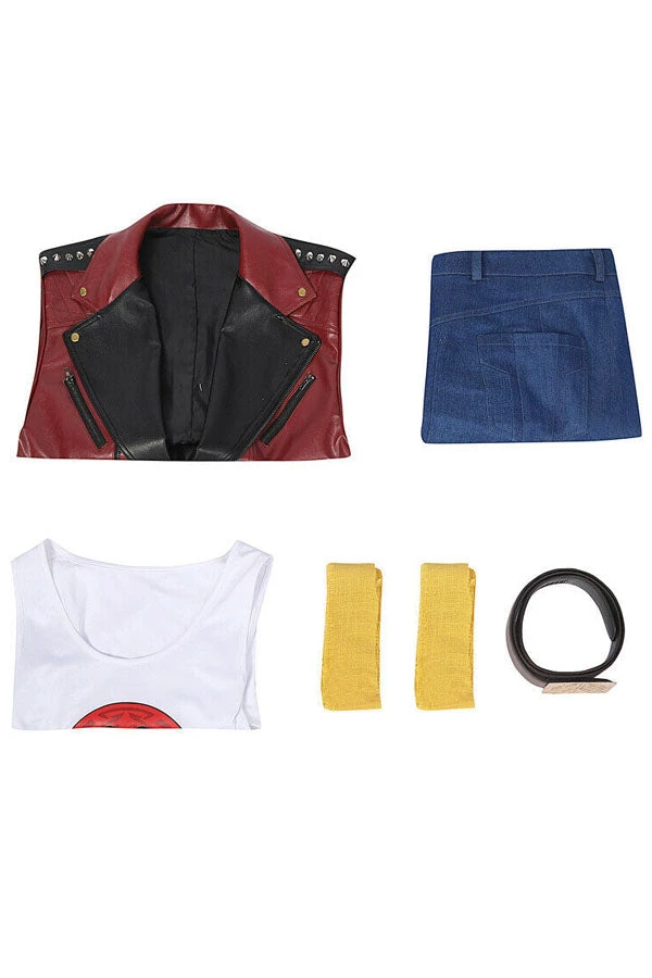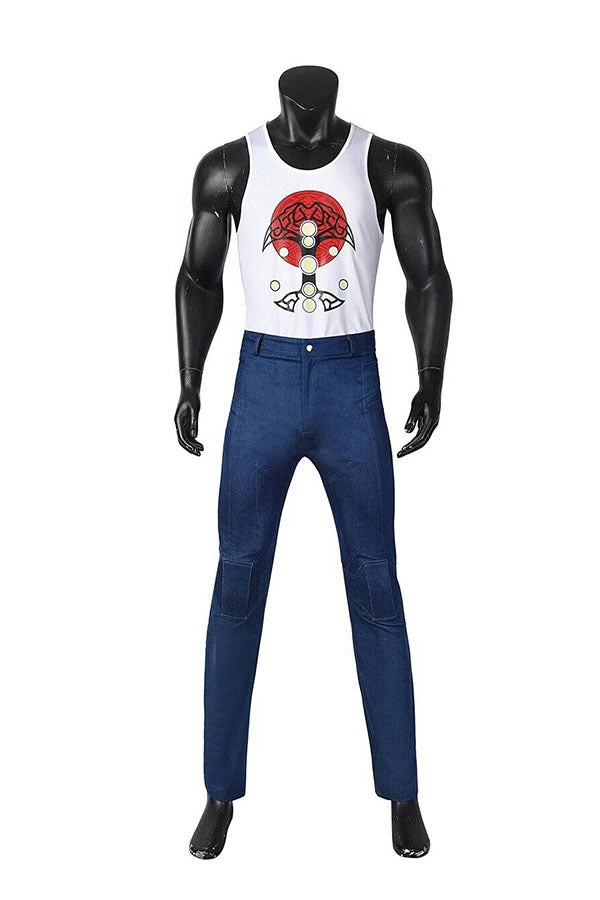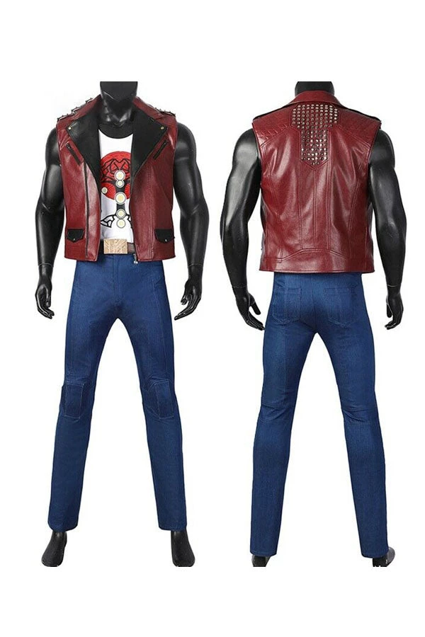 Thor casual red jacket costume as seen in 2022 Thor Love and Thunder. This thor costume has a punk style. It comes with a red vest jacket, a white tshirt, pants and calf wrappers. The jacket is made of faux leather.