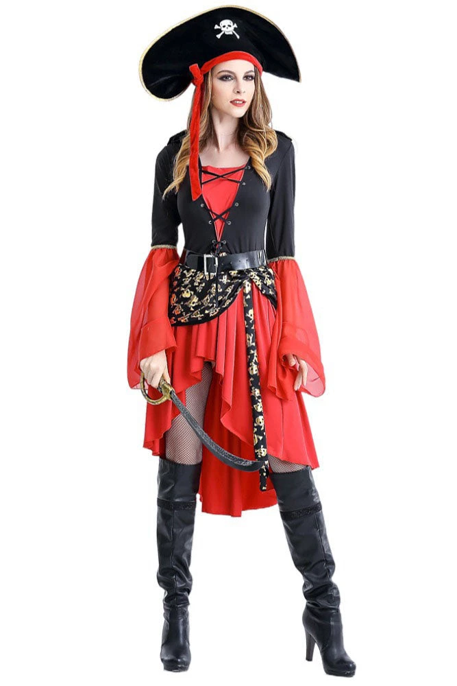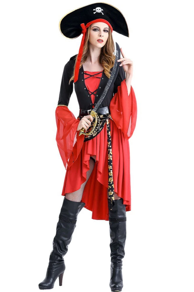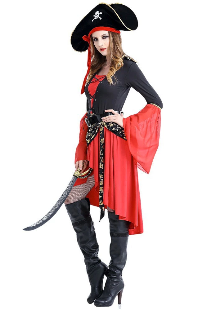 It never goes wrong to dress up as a pirate at Halloween. This asymmetrical pirate costume is feminine and playful. It comes with the dress, belt and hat. The weapon is not included.